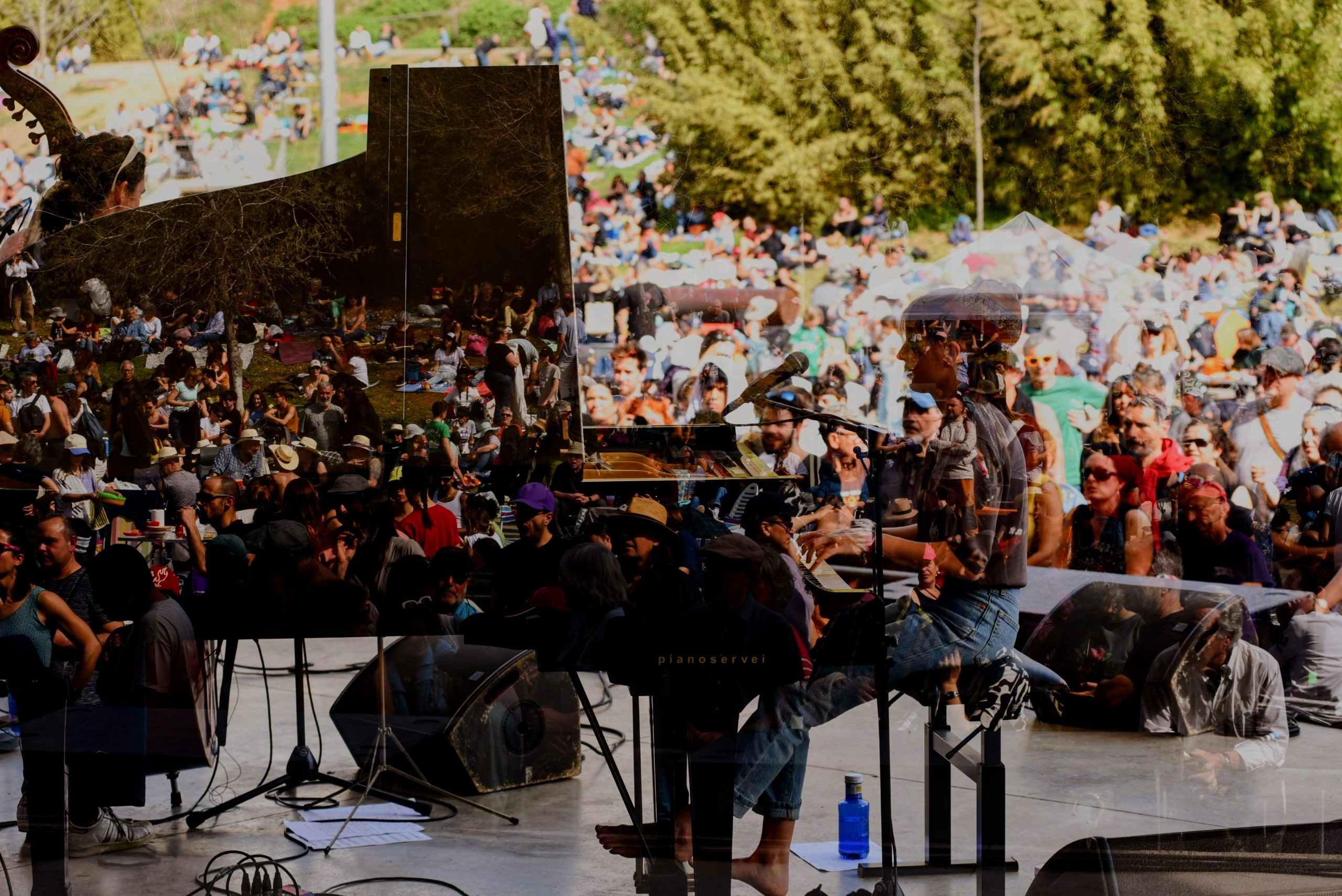The glossy piano lid mirrors the vibrant audience seated on the grass.